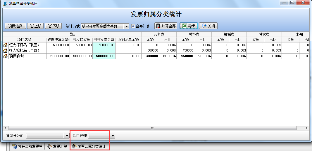 發(fā)票歸屬分類統(tǒng)計(jì)(在一個項(xiàng)目中應(yīng)控制材料票、勞務(wù)票等所占的比例,此功能用于計(jì)算掛靠單位發(fā)票歸屬所占百分比)