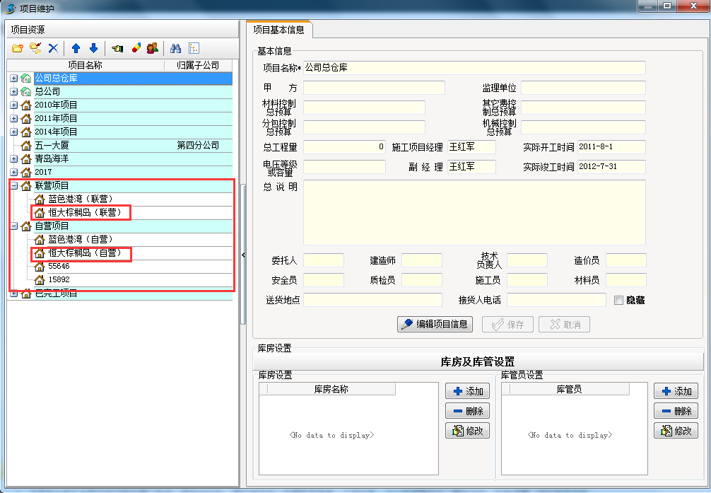 注:首先在項(xiàng)目維護(hù)中維護(hù)兩個大類(自營項(xiàng)目和聯(lián)營項(xiàng)目),兩個大類分別建立項(xiàng)目,其中在“自營項(xiàng)目”中記錄驗(yàn)收(為了統(tǒng)計(jì)掛靠單位成本)和對應(yīng)發(fā)票(為了統(tǒng)計(jì)發(fā)票歸屬分類),“聯(lián)營項(xiàng)目”中只做【財(cái)務(wù)管理】收付款不做相關(guān)的成本業(yè)務(wù)單據(jù)(如下圖)。