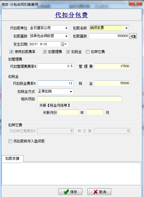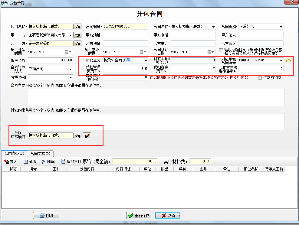 ③“分包合同”“按承包合同收款”,并“對應(yīng)承包合同編號” “關(guān)聯(lián)成本項(xiàng)目”(為了查詢發(fā)票情況自動匯總和歸屬分類)