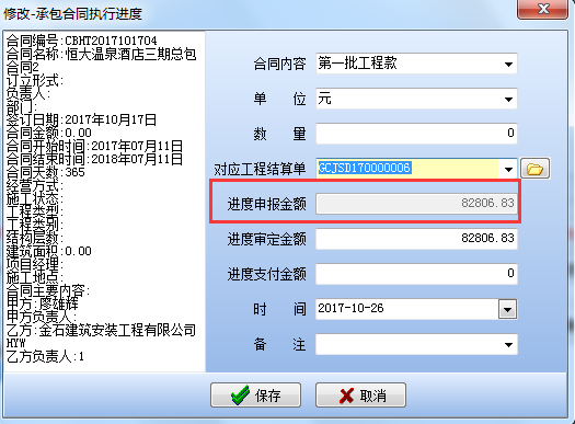 四、填寫“承包合同”執(zhí)行進(jìn)度,對(duì)應(yīng)工程結(jié)算清單,(下圖)“進(jìn)度申報(bào)金額”就是在工程結(jié)算單中填寫的暫估收款金額,“進(jìn)度審定金額”就是報(bào)給甲方審定后的最終收入金額