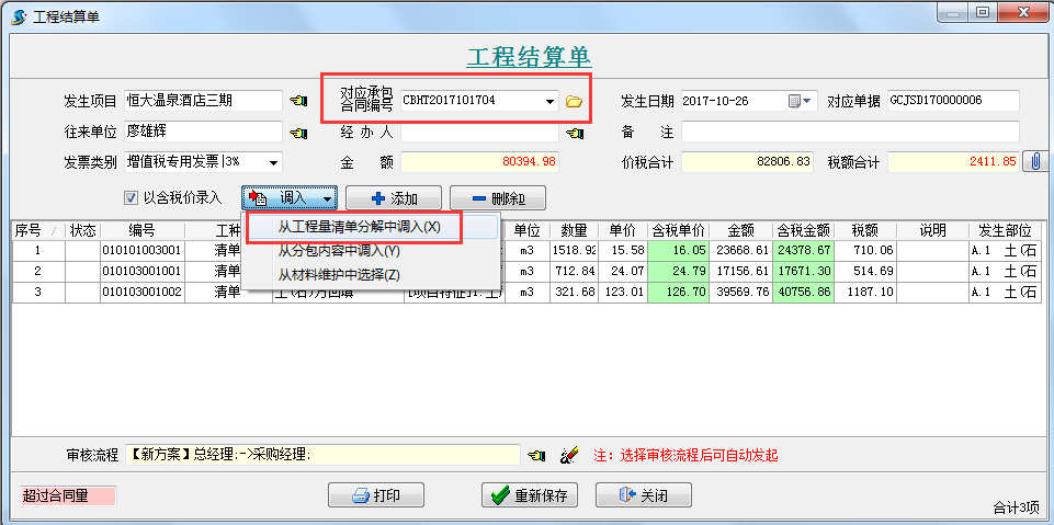 三、做工程結(jié)算單(暫估收入)對(duì)應(yīng)承包合同編號(hào),調(diào)入上圖中做好的“部位分解”中的清單內(nèi)容