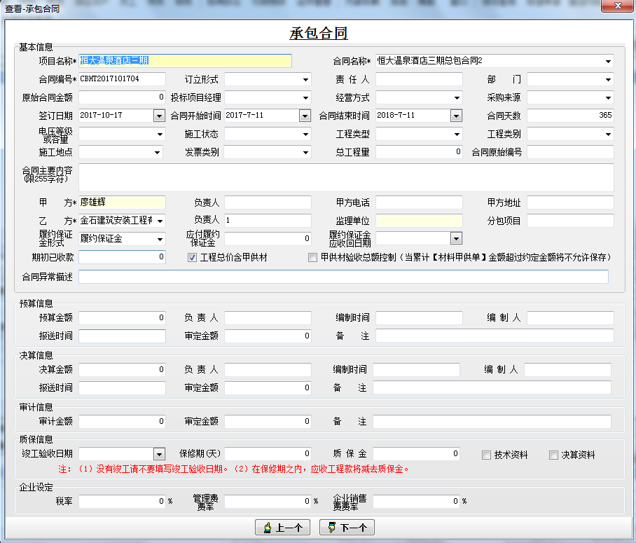 一、【工程管理】→【承包合同】 新建承包合同,選擇甲方、乙方等主要的合同內(nèi)容信息