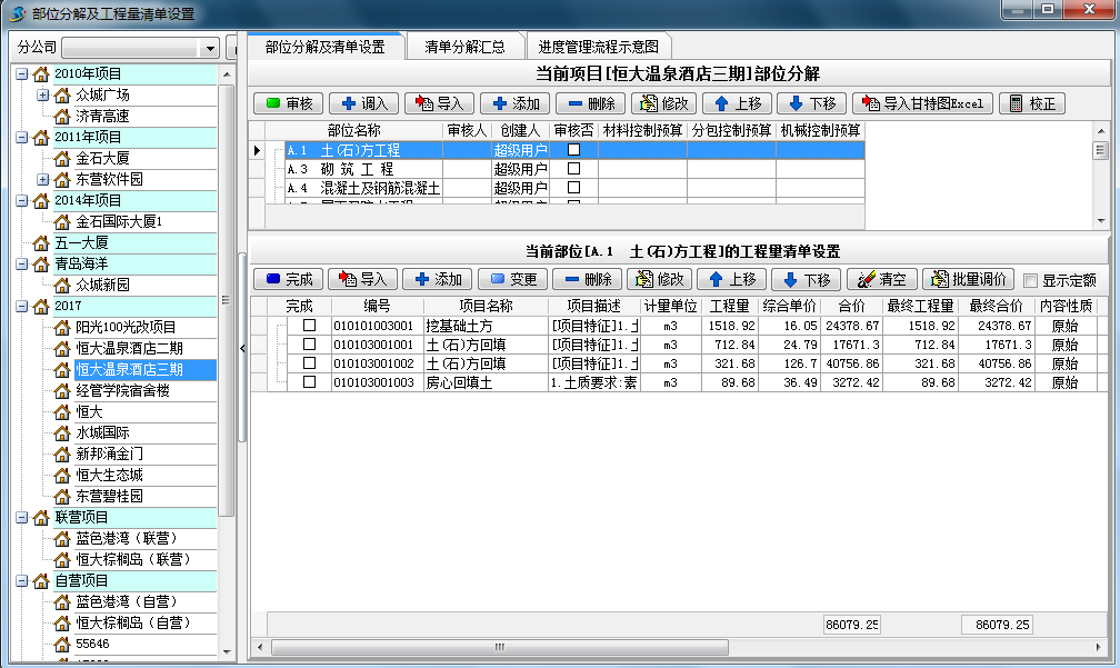 二、合同建立完成后,對(duì)項(xiàng)目進(jìn)行部位的分解(支持導(dǎo)入廣聯(lián)達(dá)、智多星等主要清單軟件做出的工程量清單直接導(dǎo)入到軟件內(nèi),也可以根據(jù)軟件的格式編輯EXCEL表格進(jìn)行導(dǎo)入)