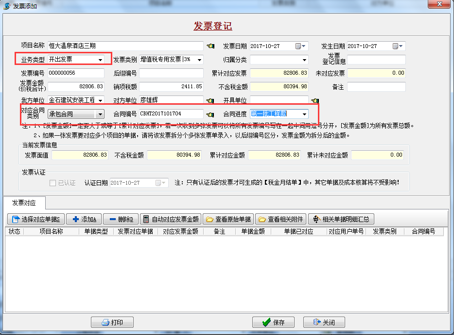 發(fā)票登記有多處需要注意,“業(yè)務(wù)類型”為開出發(fā)票(銷項(xiàng)稅),對(duì)應(yīng)“承包合同”、“合同編號(hào)”和“合同進(jìn)度”。