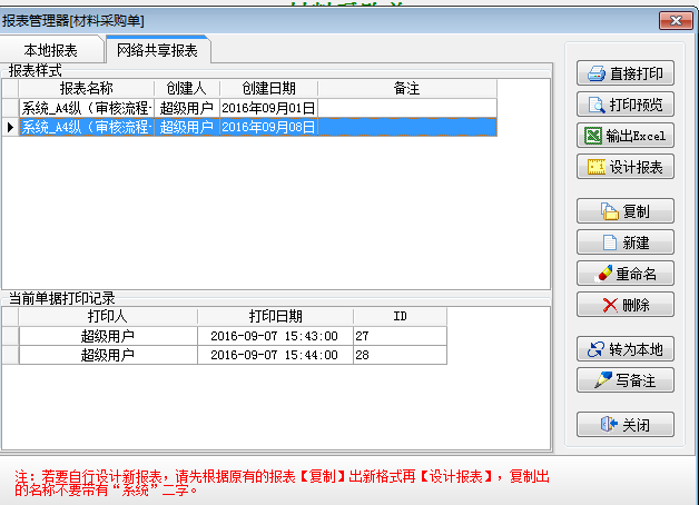 (1) 開啟【打印次數(shù)顯示】的單據(jù)報表設(shè)計只能由“超級用戶”來管理。(2) 在單據(jù)的【打印報表】界面下點擊【打印】后,無論是否打印成功,打印次數(shù)將自動加1。