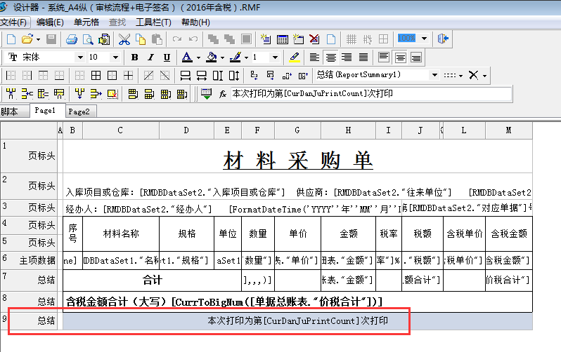打印次數(shù)變量為:[CurDanJuPrintCount],在業(yè)務(wù)單據(jù)【打印】處,選中打印報表,點擊設(shè)計報表,在報表【總結(jié)】項中增加“本次打印為第[CurDanJuPrintCount]次打印。