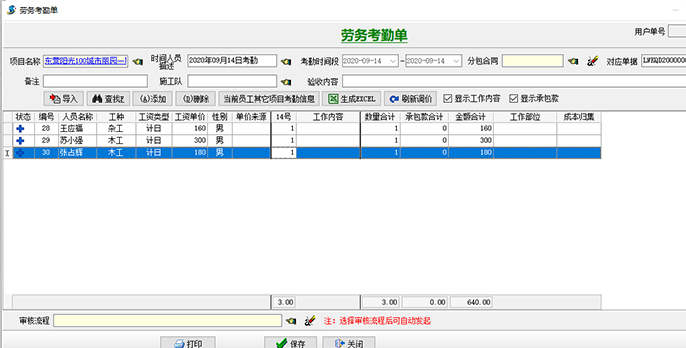 1、項(xiàng)目部以【勞務(wù)考勤單】為勞務(wù)進(jìn)出場(chǎng)的日?qǐng)?bào),需每日完成。月底根據(jù)【勞務(wù)考勤單】生成月度工資表進(jìn)行結(jié)算