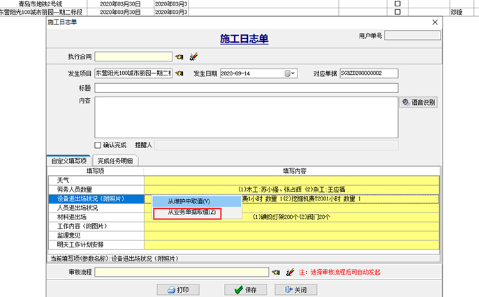 項(xiàng)目部人員選擇項(xiàng)目之后,右鍵點(diǎn)擊下圖中黃色區(qū)域,選擇彈出框中的“從業(yè)務(wù)單據(jù)取值”,系統(tǒng)會(huì)根據(jù)當(dāng)前發(fā)生日期所填報(bào)的【勞務(wù)考勤單】、【材料驗(yàn)收單】、【機(jī)械日?qǐng)?bào)單】自動(dòng)生成當(dāng)天的施工日志。