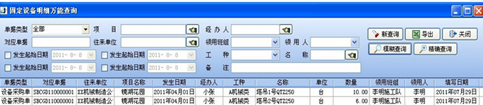每日的信息也將在系統(tǒng)中自動匯總,形成固定設(shè)備明細(xì)萬能查詢,可以說是固定設(shè)備使用的總賬。