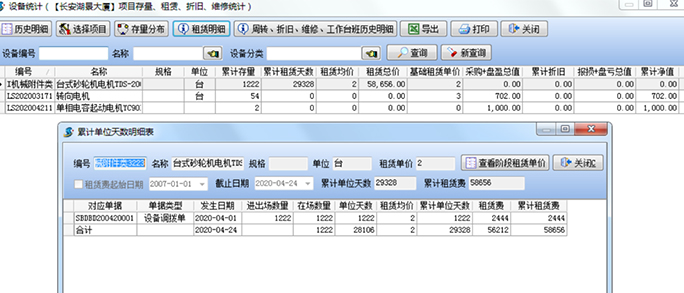 同時,已經(jīng)生成的各種信息,可以在【外包機械明細(xì)查詢】模塊查詢所有的機械往來明細(xì)。