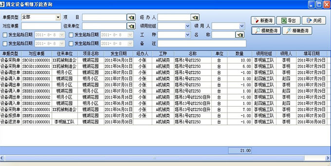 設(shè)備使用記錄功能主要由固定設(shè)備萬(wàn)能查詢模塊實(shí)現(xiàn)。該模塊由相關(guān)機(jī)械設(shè)備負(fù)責(zé)人主持,在設(shè)備領(lǐng)用時(shí)登記相關(guān)信息,包括不限于:該設(shè)備對(duì)應(yīng)單據(jù)編號(hào)、往來(lái)的單位、設(shè)備調(diào)撥的歸屬項(xiàng)目,使用日期、登記信息的責(zé)任人、設(shè)備類別、具體的名稱、數(shù)量、領(lǐng)用班組、領(lǐng)用人、填表時(shí)間等信息。