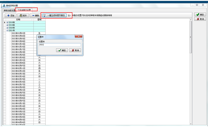 在金石工程項(xiàng)目管理軟件審核流程設(shè)置模塊,可以一鍵添加本年度法定節(jié)假日和休息日。