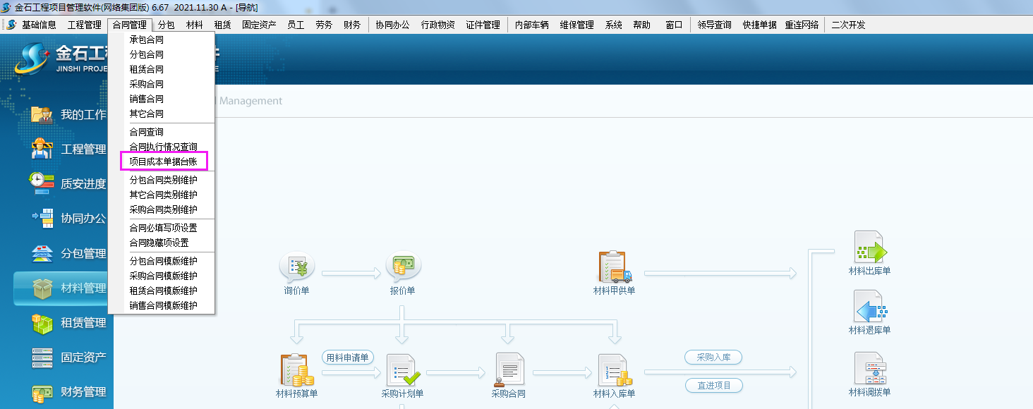 操作步驟:菜單欄→合同管理→項(xiàng)目成本單臺(tái)賬查詢(xún)
