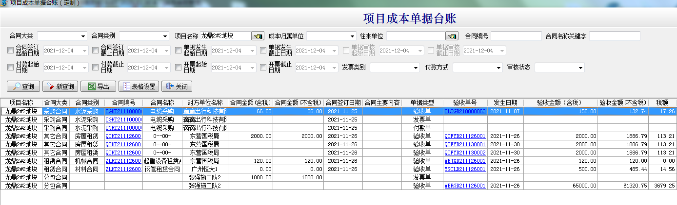 項(xiàng)目成本單據(jù)臺(tái)賬是用來(lái)查詢(xún)有合同(采購(gòu)合同、分包合同、租賃合同、其它合同)或者無(wú)合同的驗(yàn)收單(材料采購(gòu)單、設(shè)備采購(gòu)單;分包人工;外包機(jī)械單、租賃結(jié)算單、運(yùn)輸車(chē)輛單;其它費(fèi)用單;設(shè)備維修單)、付款單、發(fā)票單。