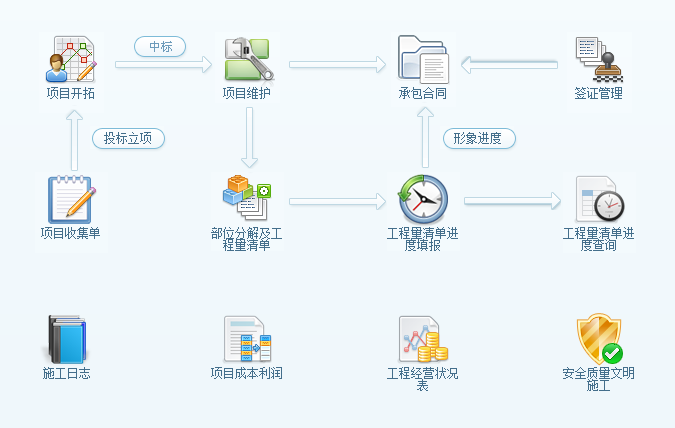 裝修工程項(xiàng)目管理軟件創(chuàng)建完善的管理體系,規(guī)范數(shù)據(jù)標(biāo)準(zhǔn)、管理步驟、信息統(tǒng)計(jì)標(biāo)準(zhǔn)、規(guī)范業(yè)務(wù)管理,增強(qiáng)企業(yè)競(jìng)爭(zhēng)力。因此,在多年的實(shí)踐中,金石軟件開發(fā)了裝飾行業(yè)的企業(yè)管理體系,整合了管理規(guī)定,滿足了這類企業(yè)提出的綜合多項(xiàng)目管理理念,如圖所示: