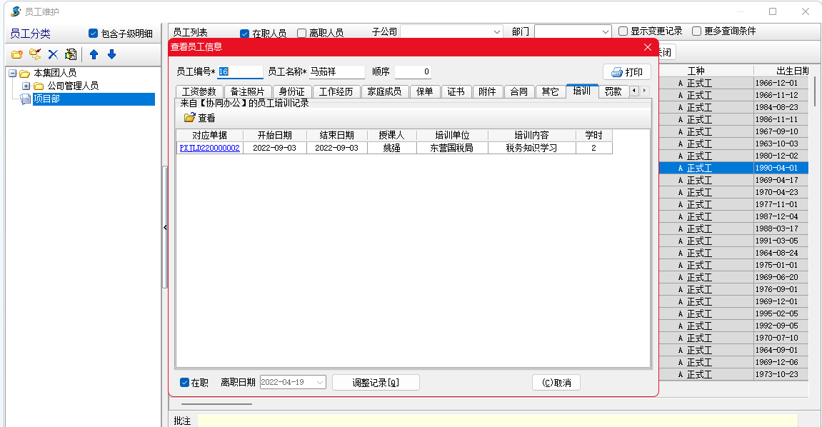 金石工程項(xiàng)目管理軟件可以填寫(xiě)員工培訓(xùn)記錄,并生成到員工維護(hù)。