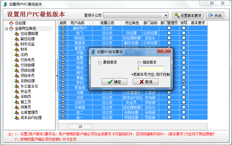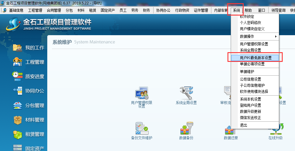 在使用金石工程項目管理軟件的過程中經(jīng)常會碰到有的同事升級了較新版本的新功能,其他同事還在使用老版本不能更好的體驗金石軟件新功能,在6.35版本中我們對此進行了限制,可要求所有用戶均升級最新版本或指定的版本,否則系統(tǒng)將將強制升級,操作流程如下: