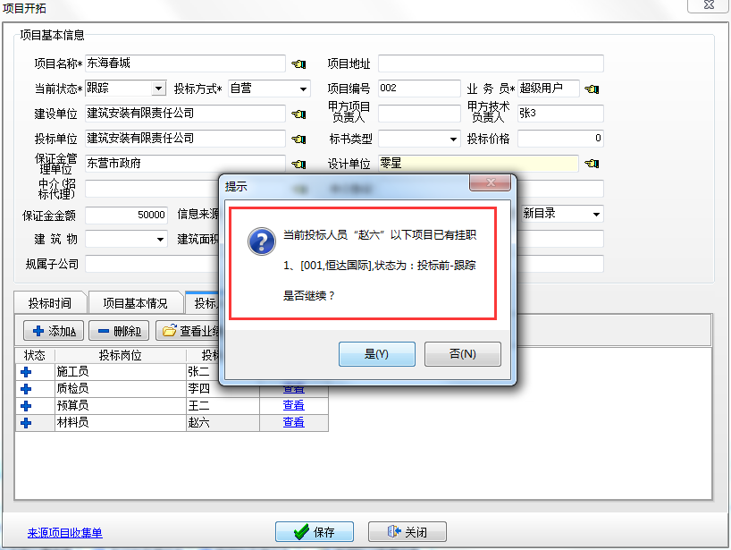 當一個投標人員參與兩個項目投標的時候,軟件在保存時就會提醒【當前人員XX,在以下項目中已有掛職】