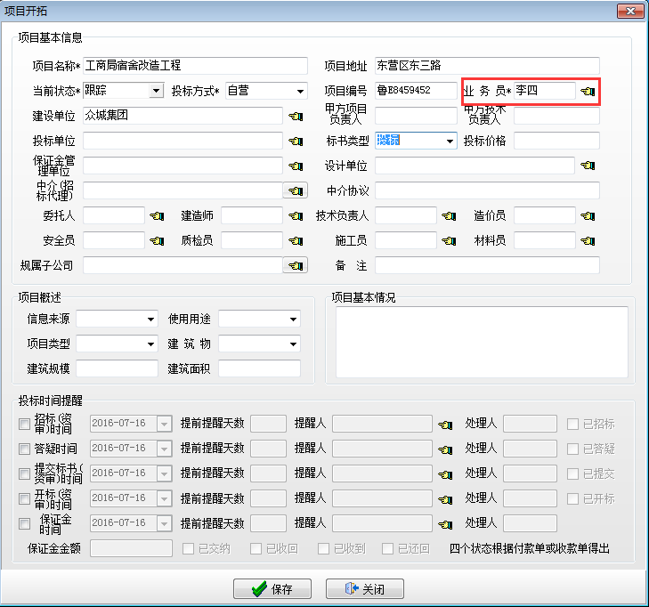 在施工項目管理軟件項目開拓建立開拓項目,【項目開拓】中業(yè)務員必須要與【銷售任務】中業(yè)務負責人一致。如下圖: