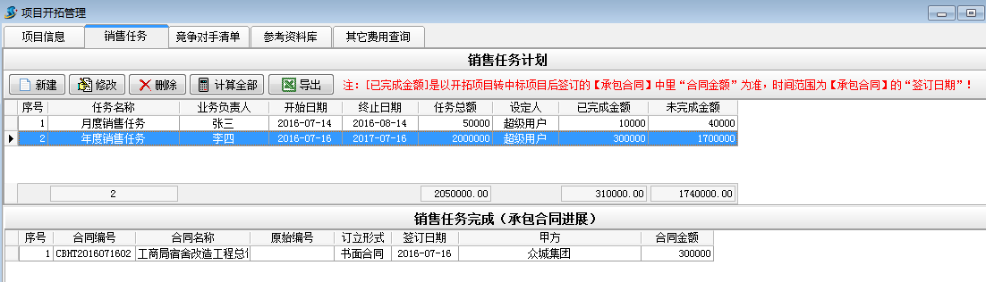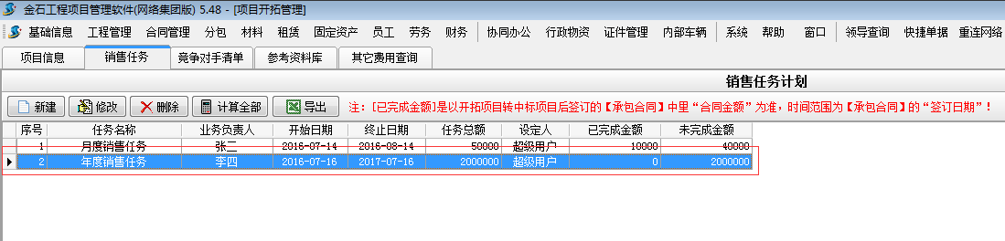 施工項目管理軟件【項目開拓】-【銷售任務】是用來管理企業(yè)給業(yè)務員設定銷售任務計劃的模塊。