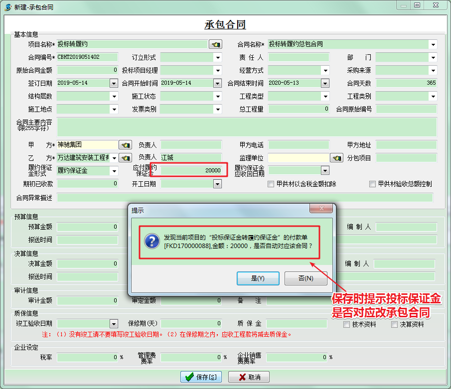 3、承包合同建立時(shí),會(huì)發(fā)現(xiàn)應(yīng)付履約保證金金額為投標(biāo)保證金的金額,而且在保存時(shí)會(huì)有是否對(duì)應(yīng)合同的提示,如下圖所示,
