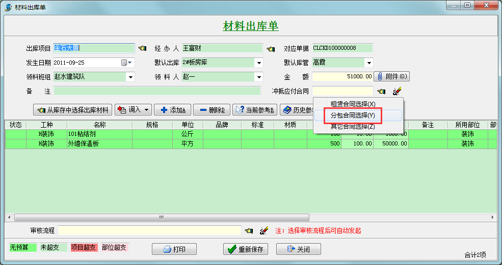 甲供材到達現(xiàn)場倉庫后,由分包商(領(lǐng)料班組)領(lǐng)走,此時做相應(yīng)的出庫單,在出庫單中我們勾選沖抵應(yīng)付合同,并選擇對應(yīng)的分包合同,如下圖所示,