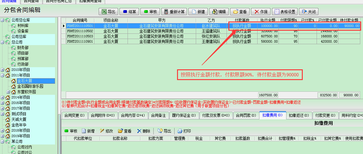 在工程項目管理中,工程款含甲供材費用的情況經(jīng)常會遇到,若總包方對外分包而且分包款也是包含甲供材費用的話,同樣的在分包管理中就應(yīng)該在分包工程款中扣除相應(yīng)的甲供材費用。或者我方給分包商提供材料。為此金石工程項目管理軟件中做出相應(yīng)的解決方案,以下為示例說明