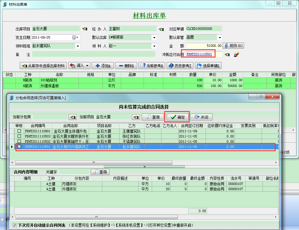 選定對應(yīng)合同后,點擊保存,這樣就可以實現(xiàn)分包工程款的沖抵。