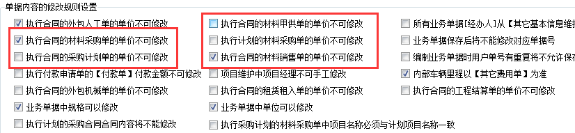 3、單據內容修改規(guī)則設置中,描述了以下幾種情況,執(zhí)行合同的材料采購單、材料甲供單、采購計劃單、材料銷售單的單價不可修改,執(zhí)行計劃的材料采購單的單價不能修改,執(zhí)行計劃的采購合同內容不能修改。