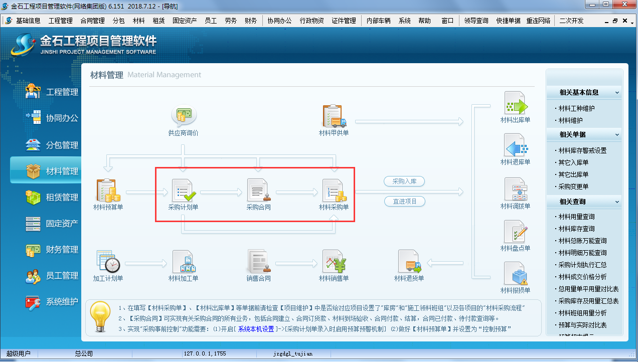 第一步,進(jìn)入工程項(xiàng)目管理系統(tǒng)的【材料管理】模塊,點(diǎn)擊[采購合同],如圖: