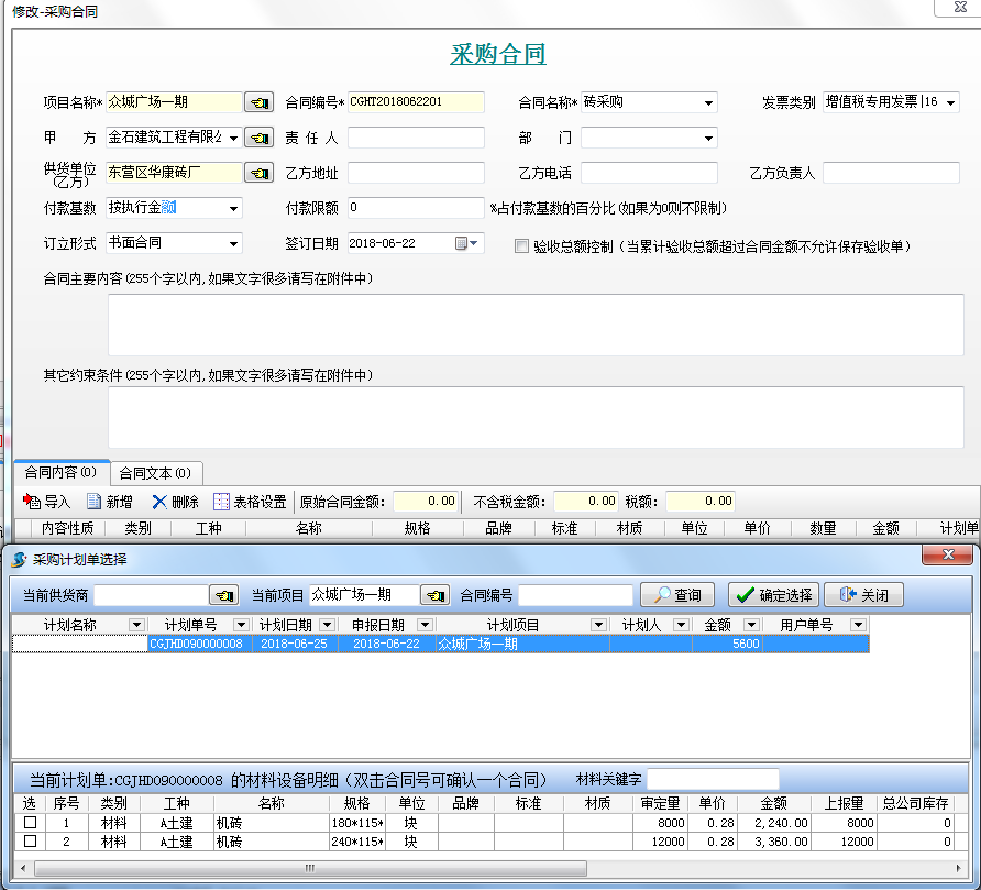 第二步,新建合同時(shí)可以從采購計(jì)劃選擇合同內(nèi)容明細(xì)。