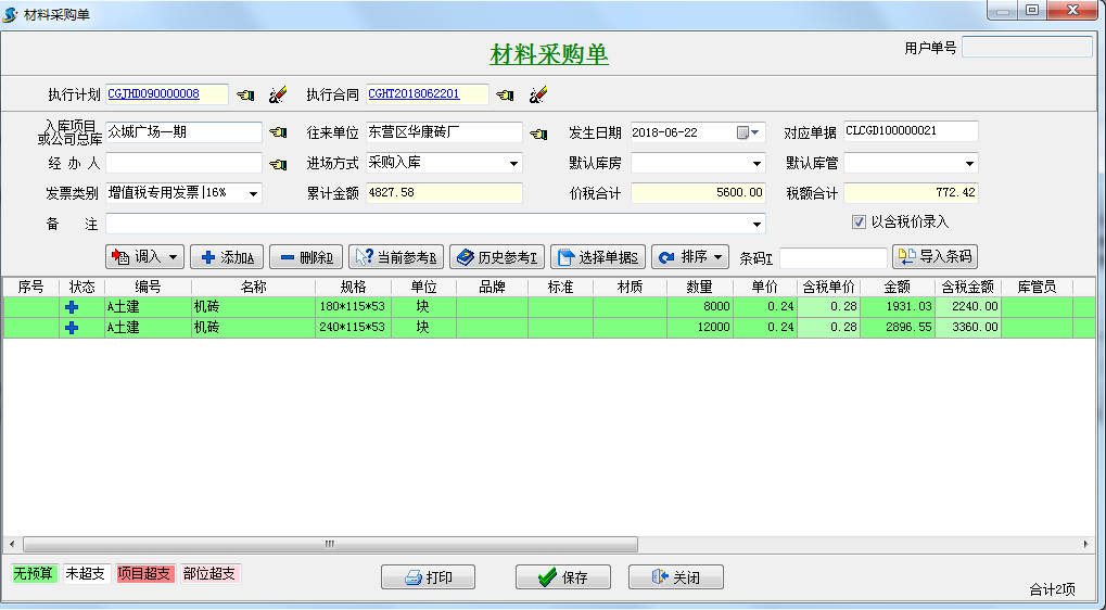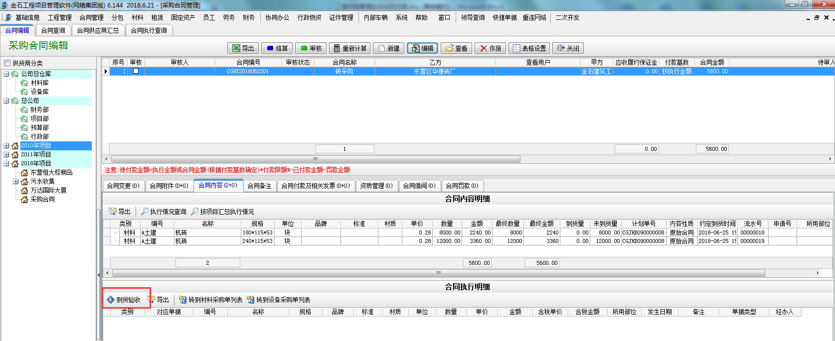 第三步,材料到貨之后,可在采購合同選擇到貨驗(yàn)收或者直接新建材料采購單選擇執(zhí)行合同。