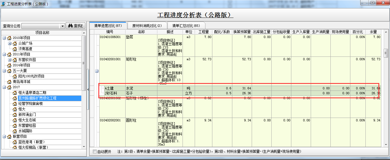 【編號(hào)、名稱(chēng)、描述、單位、工程量、配比/系數(shù)】是根據(jù)軟件中部位分解及工程量清單設(shè)置得來(lái)的;【換算預(yù)算量】是根據(jù)工程量*配比/系數(shù);【出庫(kù)施工量】是根據(jù)做的材料出庫(kù)單或者材料調(diào)撥單出庫(kù)清單成本材料;【分包驗(yàn)收量】是根據(jù)做的外包人工單計(jì)算得來(lái)的; 【生產(chǎn)入庫(kù)量】是根據(jù)做的材料加工單成品材料得來(lái);【生產(chǎn)消耗量】是根據(jù)是根據(jù)做的材料加工單原材料得來(lái);【現(xiàn)場(chǎng)使用量】是根據(jù)做的材料出庫(kù)單或者材料調(diào)撥單出庫(kù)原材料;【百分比】是根據(jù)出庫(kù)施工量/換算預(yù)算量;【余量】:第一級(jí)清單余量=換算預(yù)算量-(出庫(kù)施工量+分包驗(yàn)收量),第二級(jí)、材料余量=換算預(yù)算量-(生產(chǎn)消耗量+現(xiàn)場(chǎng)使用量)。