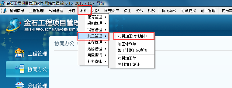 在軟件“材料”模塊找到“加工管理”→“材料加工消耗維護(hù)”→“關(guān)聯(lián)清單”