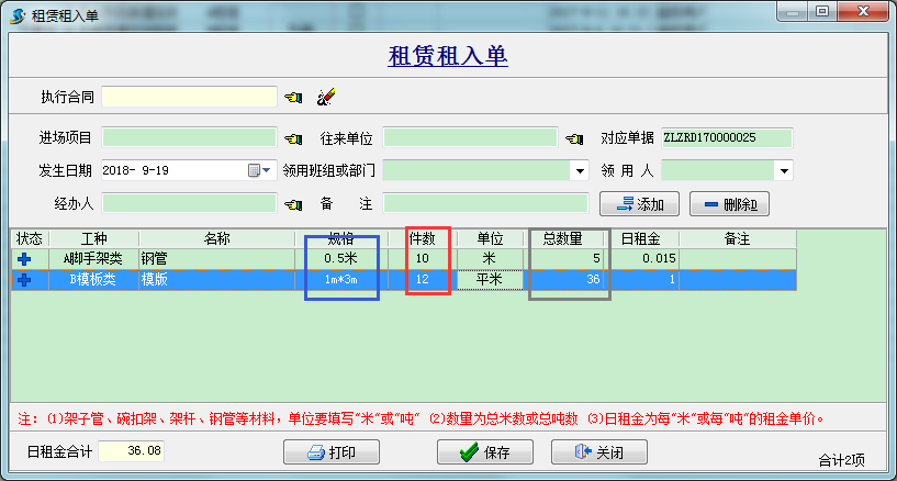 當(dāng)開啟此開關(guān)時(shí),我們在做相應(yīng)租入單、還租單等業(yè)務(wù)單據(jù)時(shí),相應(yīng)租入材料系統(tǒng)會自動做相應(yīng)換算,由根數(shù)自動換算成米(計(jì)費(fèi)單位),由此可省去用戶自己去做換算的過程,大大加快了錄單效率。如下圖