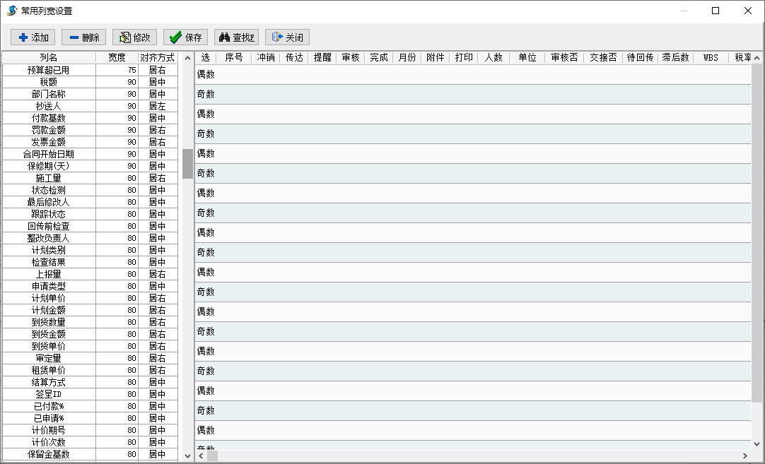 六、常用列寬設(shè)置 - 對(duì)列表或查詢表格中不同字段的列寬做單獨(dú)設(shè)置,分字段名、寬度和對(duì)齊方式3種設(shè)置,字段名必須與列表或查詢表格中的字段名一致,否則無(wú)法生效;寬度為字段的顯示寬度,原則為恰好或更好顯示當(dāng)前字段內(nèi)容為準(zhǔn);對(duì)齊方式分居中、居左和居右3種方式,原則上推薦數(shù)字類居右顯示,其他字段可根據(jù)用戶個(gè)體習(xí)慣自行設(shè)置,設(shè)置界面圖如下: