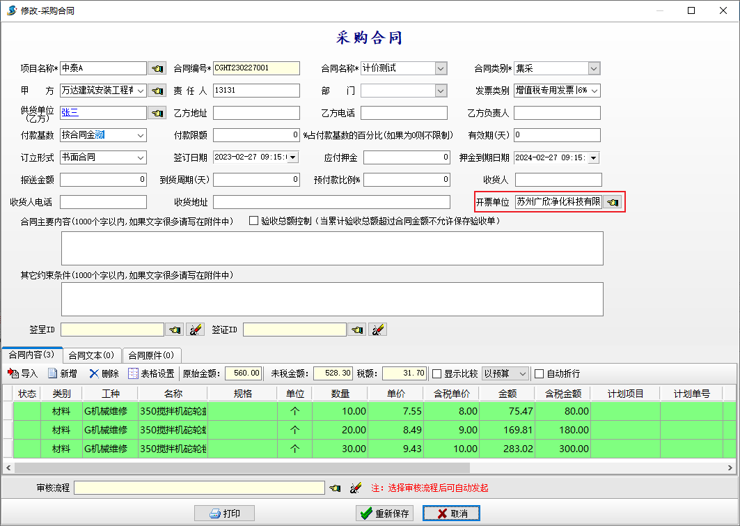 為了解決供貨單位和開票單位不一致的情況,【采購合同】增加“開票單位”字段。如下圖所示: