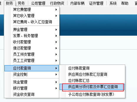 點(diǎn)擊【財(cái)務(wù)】→【應(yīng)付款查詢】→【供應(yīng)商分項(xiàng)付款及開(kāi)票匯總查詢】,在彈出的界面中,如下圖所示,