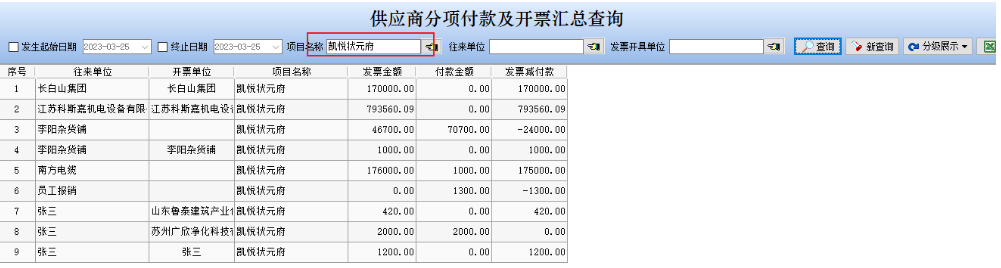 在【供應(yīng)商分項(xiàng)付款及開(kāi)票匯總查詢】中,可根據(jù)項(xiàng)目名稱、往來(lái)單位和開(kāi)票單位進(jìn)行篩選,同時(shí)在表格中可體現(xiàn)項(xiàng)目名稱、往來(lái)單位、開(kāi)票單位、發(fā)票金額、付款金額和發(fā)票減付款金額等字段。