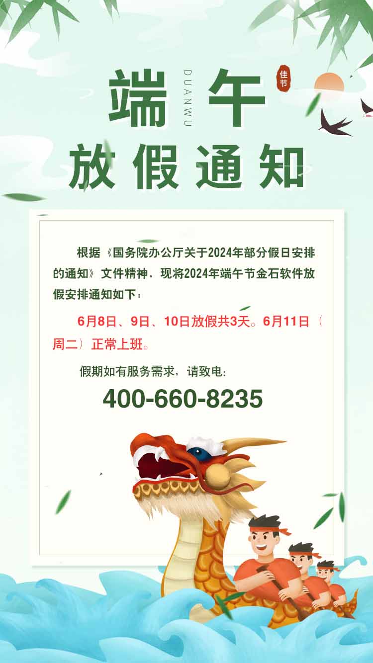 金石軟件定于2024年6月08日-10日放假,假日服務熱線:400-660-8235