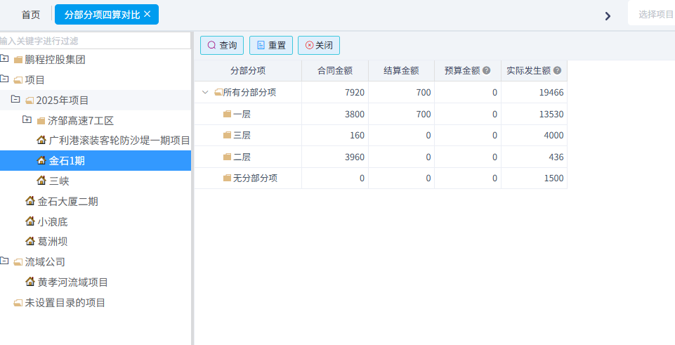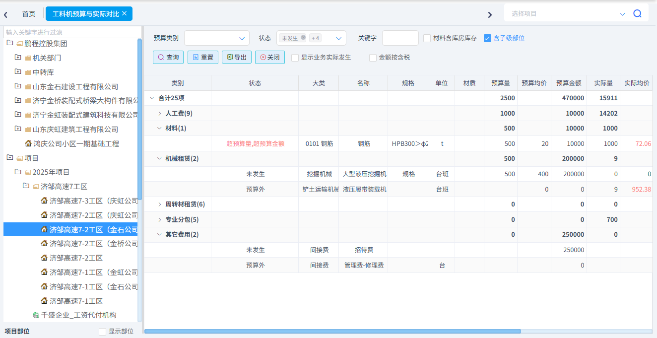 可以統(tǒng)計工料機(jī)預(yù)算與實際對比、合同清單與實際發(fā)生對比、分部分項四算對比