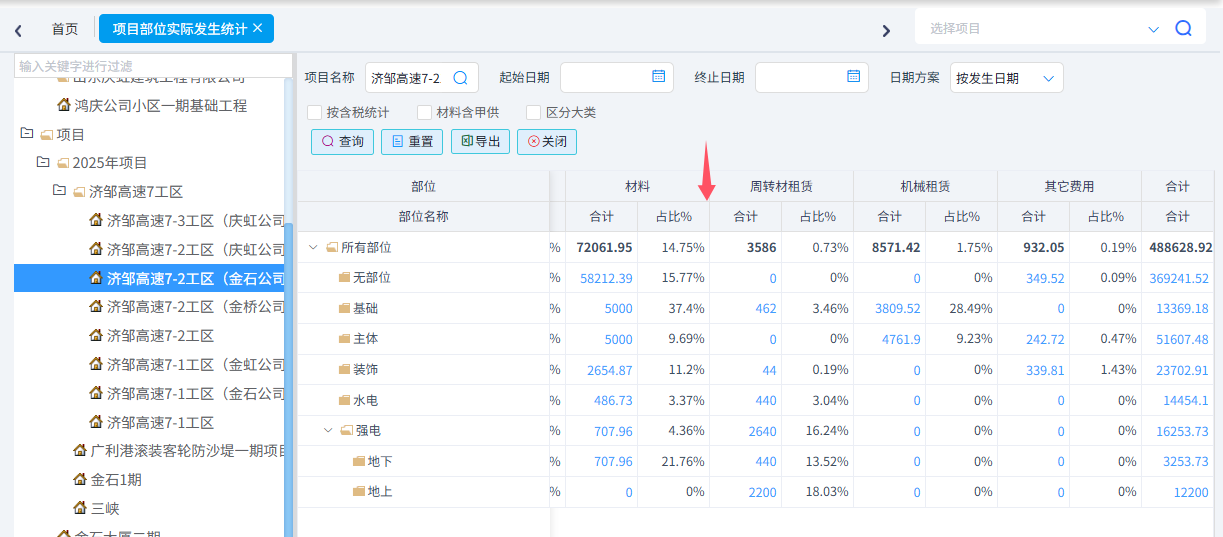 項目部位實際發(fā)生統(tǒng)計