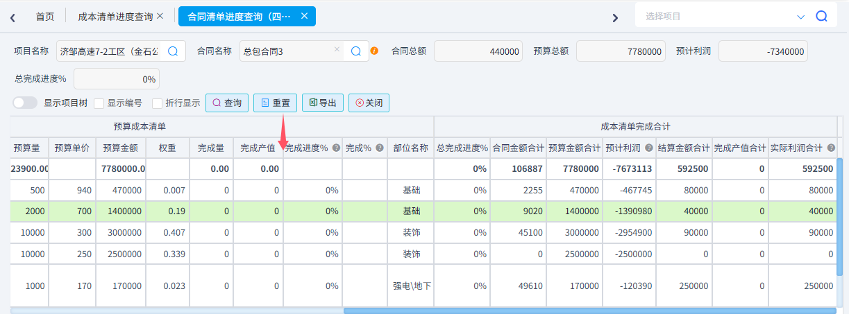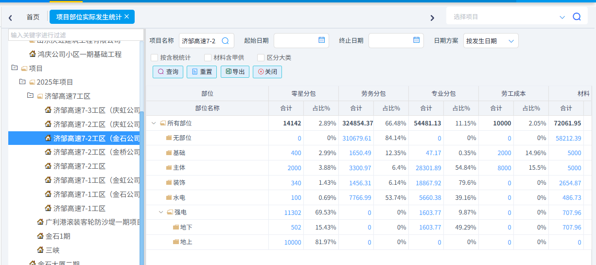 可以根據(jù)需求統(tǒng)計成本清單進(jìn)度、合同清單進(jìn)度(四算對比)、項目部位實際發(fā)生以及部位分解預(yù)算與實際發(fā)生。