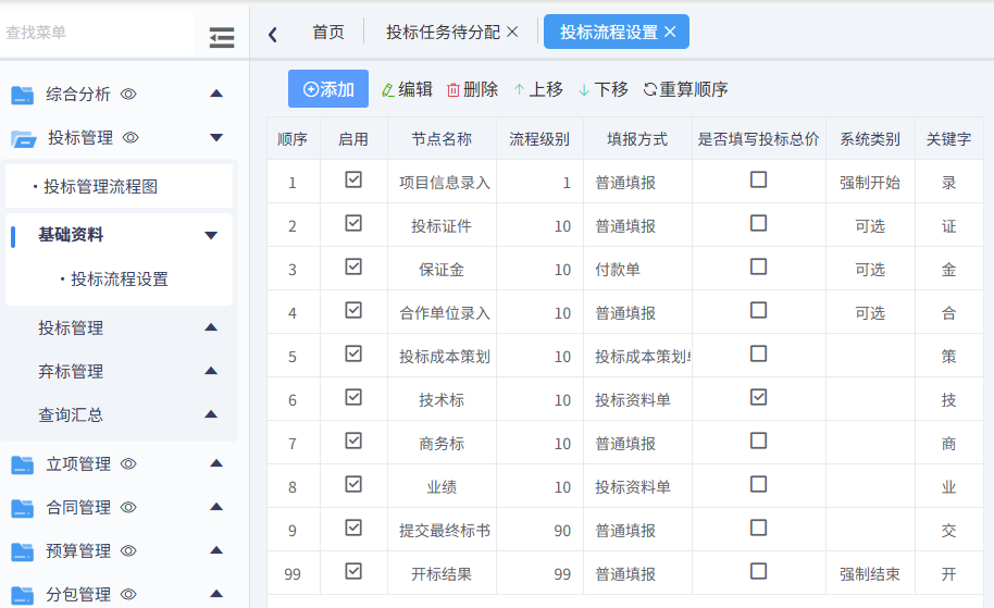在此界面中的投標(biāo)任務(wù)節(jié)點,是在投標(biāo)流程設(shè)置中預(yù)先設(shè)置好的,若與公司現(xiàn)有流程有差異,可自行設(shè)置投標(biāo)流程