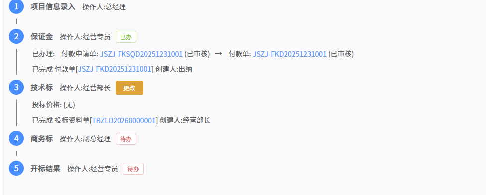 付款申請審核通過后,由財務(wù)出納做付款單,完成投保金付款的閉環(huán)。在投標(biāo)任務(wù)已辦中,可看到狀態(tài)的變化。如下圖所示