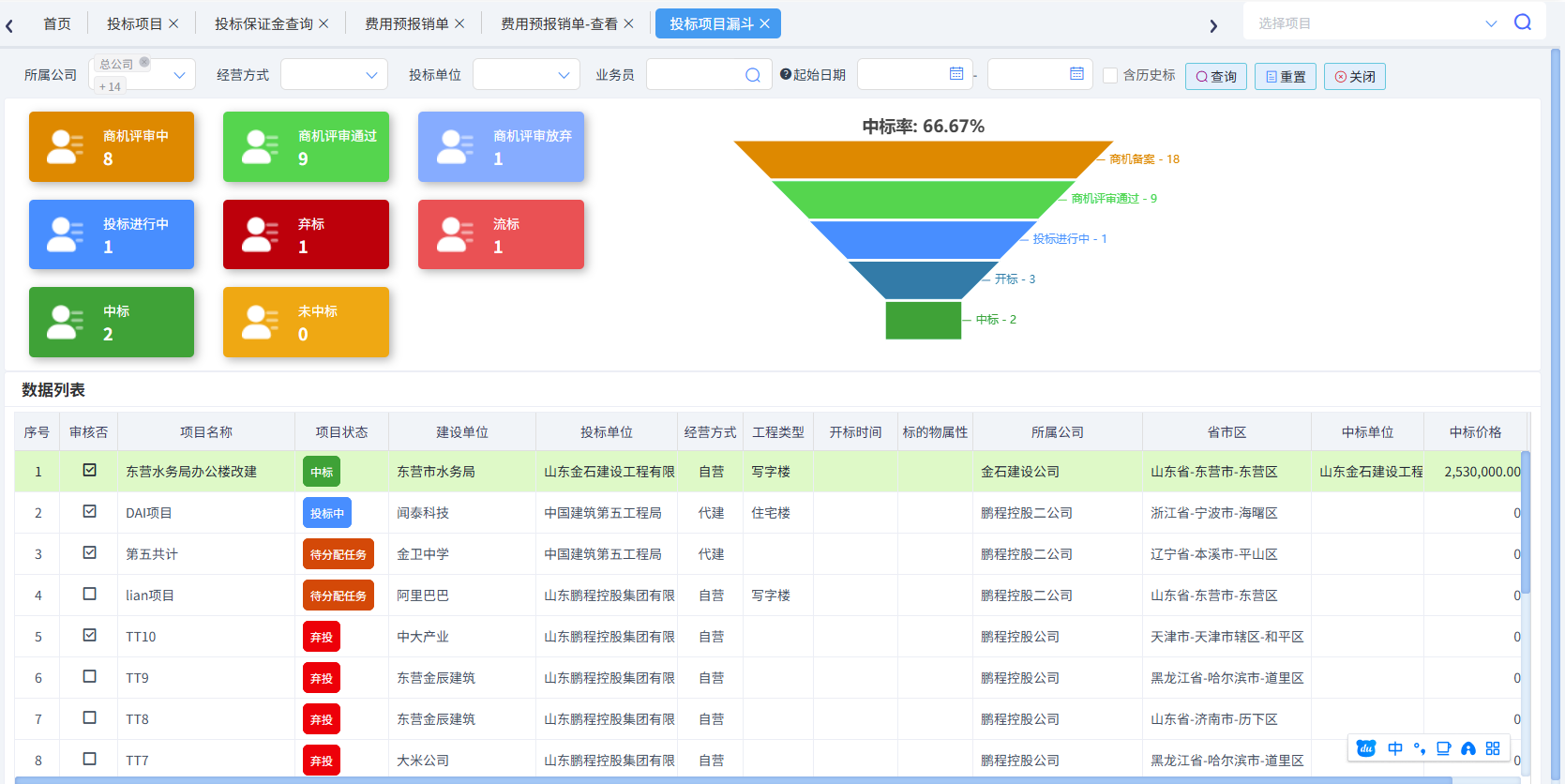 投標(biāo)項目一覽表可以查看投標(biāo)項目狀態(tài)、完成度、投標(biāo)任務(wù)節(jié)點、中標(biāo)單位、中標(biāo)金額等信息,如下圖所示