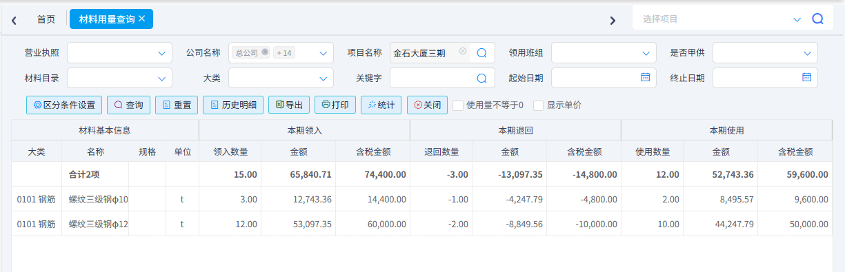 是用于查詢工地材料用量。可以按照營業(yè)執(zhí)照、公司、項(xiàng)目、班組、材料名稱、時(shí)間等篩選材料用量信息