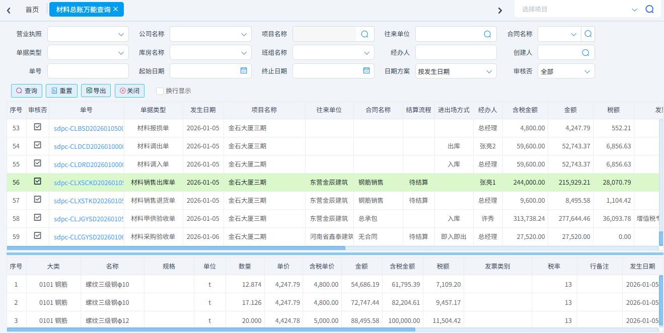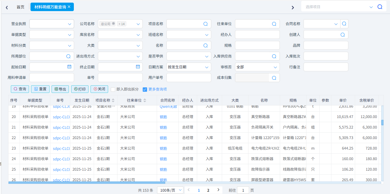 查詢所有類型的材料單據(jù)。一般用于材料單據(jù)的對賬。可以按照單據(jù)類型、項目名稱、供應(yīng)商、材料名稱、時間等條件進(jìn)行篩選。可以導(dǎo)出excel表格。