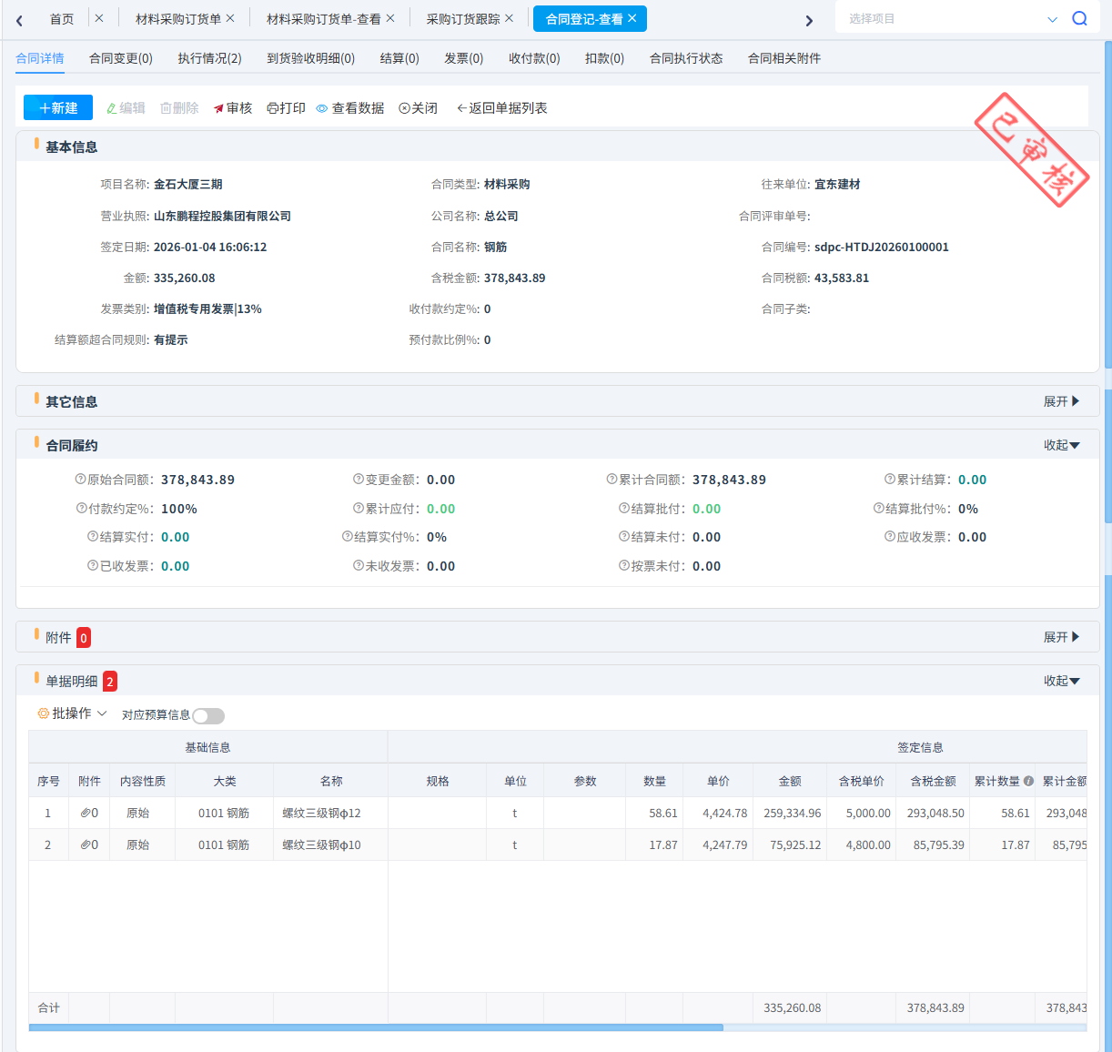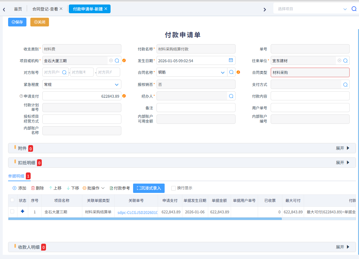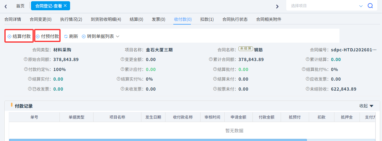 我們以生成合同為例,在合同里可以操作合同變更、材料到貨驗(yàn)收、材料退貨、材料結(jié)算、合同扣款、合同預(yù)付款、合同結(jié)算付款、合同收進(jìn)發(fā)票。