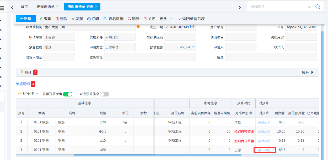 首先由項(xiàng)目現(xiàn)場(chǎng)施工員根據(jù)工程進(jìn)度填寫用料申請(qǐng)。申請(qǐng)材料明細(xì)可以從工料機(jī)預(yù)算中調(diào)取,超出預(yù)算時(shí)系統(tǒng)會(huì)進(jìn)行預(yù)警,當(dāng)購(gòu)買的材料跟預(yù)算不一致是還可以手動(dòng)對(duì)應(yīng)預(yù)算。在用料申請(qǐng)單還可以選擇貨物來(lái)源,選擇采購(gòu)訂貨、自購(gòu)、調(diào)撥、甲供。其中選擇采購(gòu)訂貨可以生成采購(gòu)訂貨單和采購(gòu)合同一般用于大宗采購(gòu)或者集采。選擇自購(gòu)可以直接生成采購(gòu)訂貨單,一般用于零星采購(gòu)或者項(xiàng)目部直接采購(gòu)。調(diào)撥用于申請(qǐng)項(xiàng)目調(diào)撥材料使用,后續(xù)可以生成材料調(diào)出單。甲供用于申請(qǐng)甲供材料,后續(xù)可以生成材料甲供驗(yàn)收單。